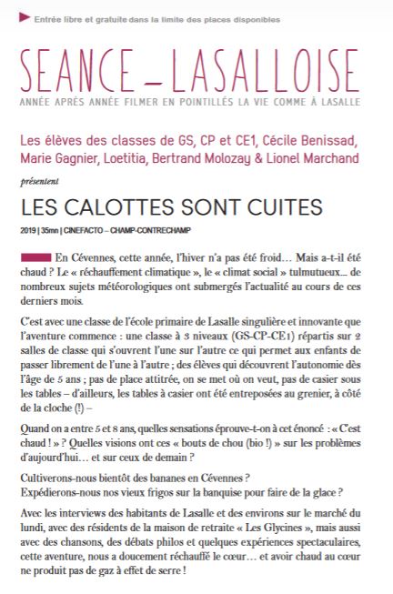 Durée : 35 minutes - 2015 7 éditions de séances Lasalloise à hauteur d'enfants. Les médias (2005), Le bonheur (2009), Amour, gloire, etc. (2010), Quand aurons-nous le temps ? (2011), Même pas peur (2012), Et maintenant ? (2013), Lo paratge (2014) Autant