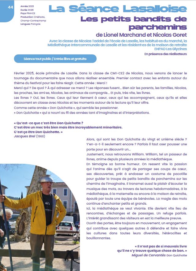 Réalisation d'un film documentaire avec la classe de CE2 - CM1 de l'école de Lasalle février à mai 2025 Association CHAMP / CONTRECHAMP Réalisation : Lionel Marchand / Nicolas Goret LA SEANCE LASALLOISE " Les petits bandits de parchemins " De Lionel Marchand et Nicolas Goret - durée : 35mn