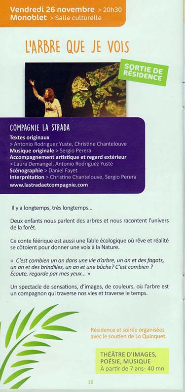 L' arbre que je vois (version longue) Daprès une idée originale de Christine Chantelouve - Création visuelle et interprétation : Christine Chantelouve - Création sonore et musicale, interprétation : Sergio Perera - Collaboration artistique : Josiane Fritz Pantel - Co-Ecriture : Antonio Rodriguez Yuste et Christine Chantelouve - Scénographie : Daniel Fayet - Crédits Photo : Gilles Clément et Marc Ginot